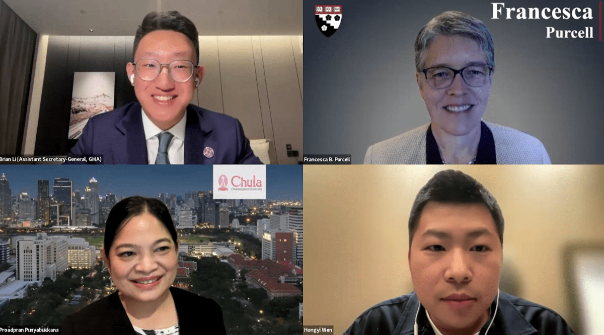 Speakers for the session including Proadpran Punyabukkana (Chief Learning Innovation Officer; Associate Professor of Computer Engineering, Chulalongkorn University), Francesca Purcell (Faculty Co-Chair, Higher Education Concentration; Faculty Co-Chair, Online Master’s in Education; Senior Lecturer on Education, Harvard Graduate School of Education), and Hongyi Wen (Assistant Professor of Computer Science, Shanghai New York University) shared their insightful remarks around the theme of “AI-Empowered Higher Education.” Brian (Yifan) Li, Assistant Secretary-General of GMA and Senior Manager of Tsinghua University’s Online Education Center, hosted the session. The dialogue was broadcast live on XuetangX with a global audience of over 10,000 views.